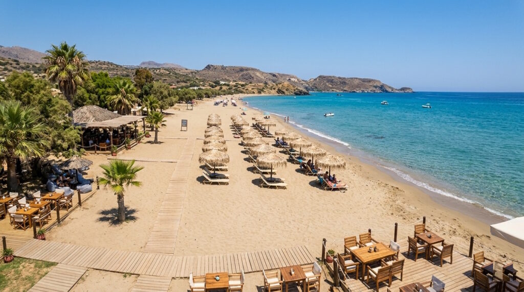 • Matala Beach is famous for its historical caves and bohemian vibe, perfect for those seeking a mix of culture and beach fun.